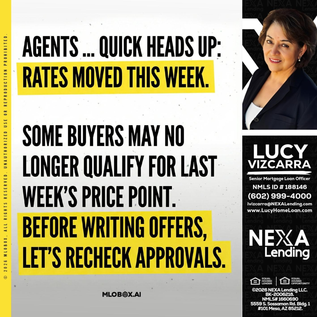 agents quick heads up - Lucy Vizcarra -Mortgage Loan OfficerHi, my name is Lucy Vizcarra. I’m a Loan Officer with NEXA Lending LLC., offering personalized mortgage solutions, fast customized quotes, great rates and service with integrity.