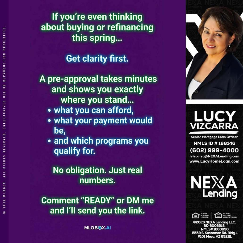 IF YOU THINKING - Lucy Vizcarra -Mortgage Loan OfficerHi, my name is Lucy Vizcarra. I’m a Loan Officer with NEXA Lending LLC., offering personalized mortgage solutions, fast customized quotes, great rates and service with integrity.