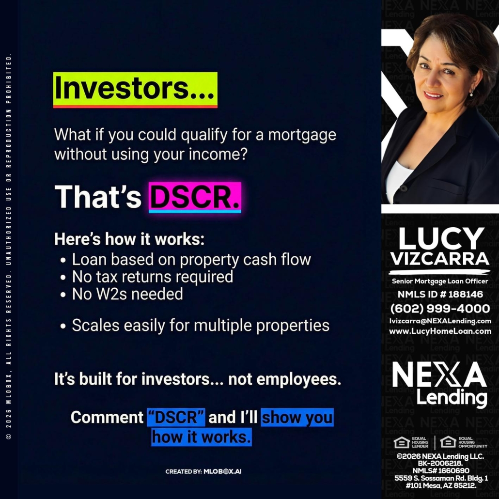 INVESTORS - Lucy Vizcarra -Mortgage Loan OfficerHi, my name is Lucy Vizcarra. I’m a Loan Officer with NEXA Lending LLC., offering personalized mortgage solutions, fast customized quotes, great rates and service with integrity.